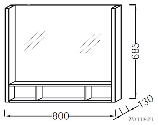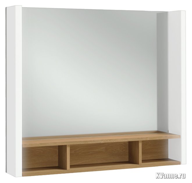 Зеркало со светодиодной подсветкой справа и слева и инфракрасным датчиком. Внизу зеркала расположены две открытые полки.