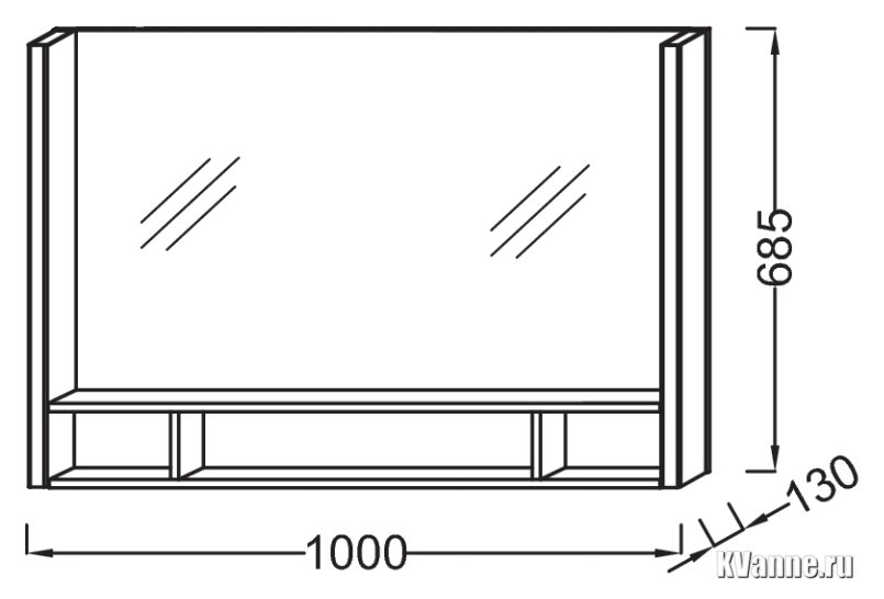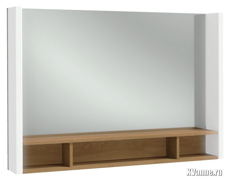 Зеркало со светодиодной подсветкой справа и слева и инфракрасным датчиком. Внизу зеркала расположены две открытые полки.