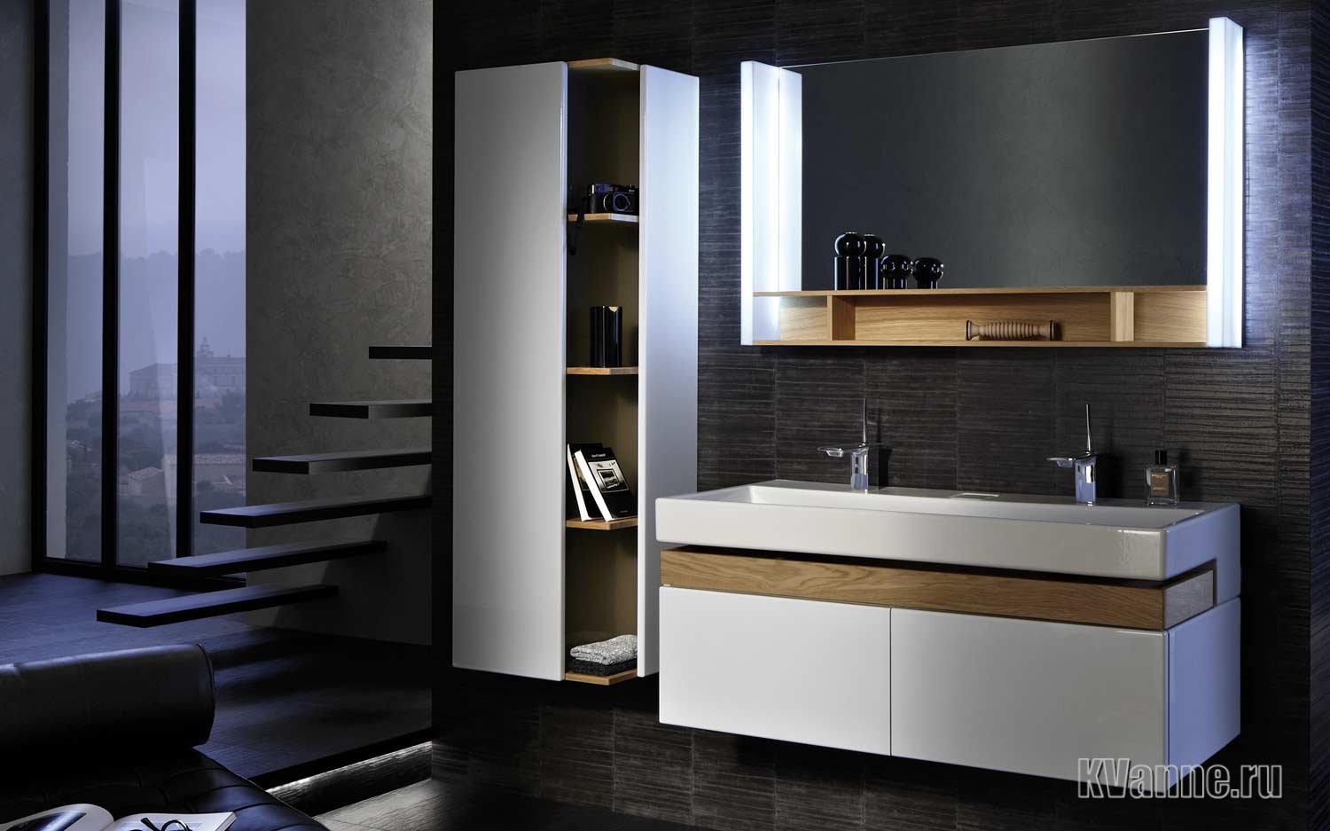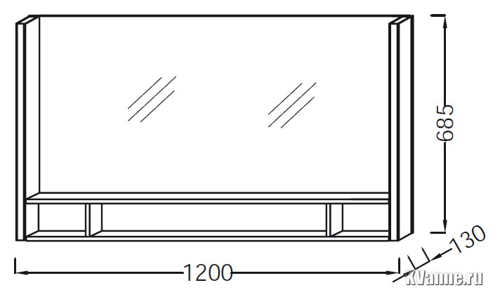 Зеркало со светодиодной подсветкой справа и слева и инфракрасным датчиком. Внизу зеркала расположены две открытые полки.