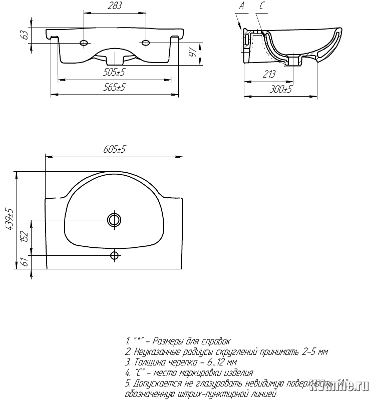 Встраиваемая полукруглая раковина 60,5х43,9 см с 1 отверстием под смеситель.