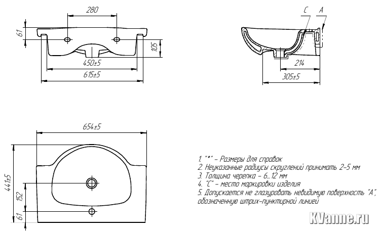 Встраиваемая полукруглая раковина 65,4х44,1 см с 1 отверстием под смеситель.
